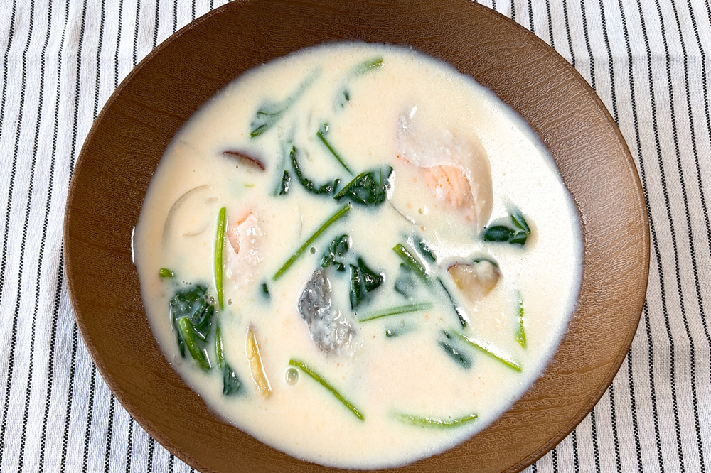 | ④ | 水を加え、とろみがつくまで強火にかける。 火を止め、鮭を入れて弱火~中火で10分ほど煮込む。 |